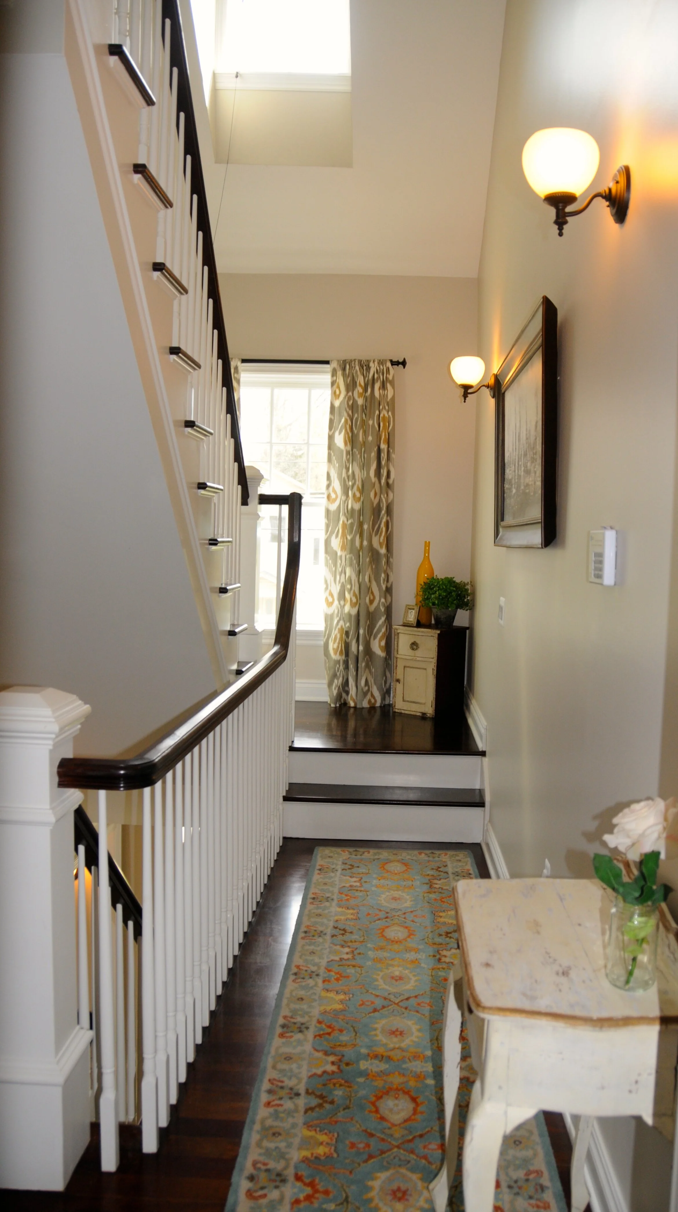 This new construction in downtown Royal Oak came to us with builder grade cabinets and fixtures, but extraordinary millwork that we used as inspiration for the design process. We began with the development of a custom exterior paint color that created warm curb appeal. High ceilings and dramatic use of moldings provided a beautiful canvas for creating a traditional space for a modern family. A naturally lit first floor provided opportunity for a dramatically painted dining room in a Farrow and Ball dark gray. Custom relaxed roman shades allowed light control for lounging or TV watching in the family room. In the master bedroom, a formal Schumacher wallpaper was used on an accent wall behind a winged upholstered bed.